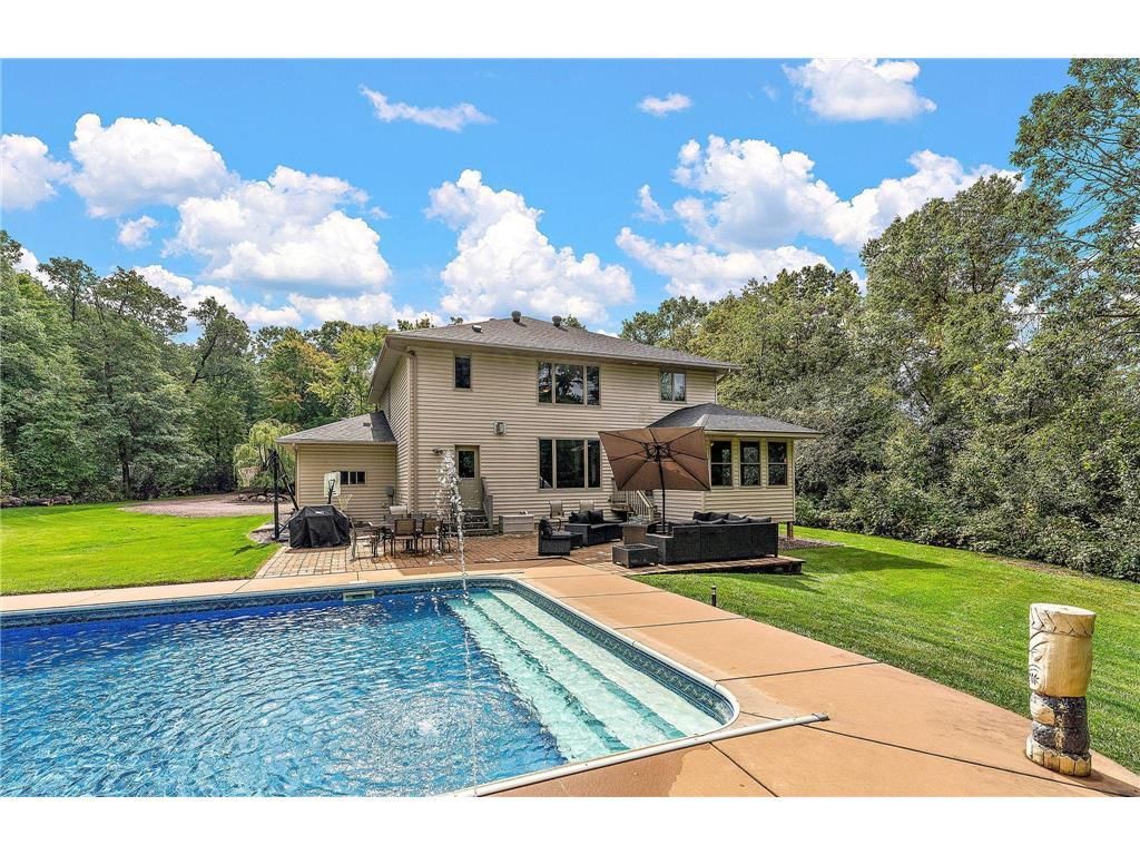 Your private woodland retreat ? where modern luxury meets timeless serenity. Tucked deep within nearly seven acres of untouched forest, this 4,000+ sq ft residence offers the rare combination of privacy, nature, and refined living?all just minutes from Highway 94 and an easy drive to the Twin Cities. Every inch of the home has been thoughtfully updated and lovingly maintained, creating a peaceful haven designed for comfort, beauty, and effortless living. Step inside to a breathtaking two-story great room, where floor-to-ceiling windows frame the wooded landscape like moving artwork. Sunlight pours across the oak hardwood floors, drawing you toward an airy loft and flexible sitting room/office?ideal for remote work, relaxation, or creative space. At the heart of the home is a warm kitchen, featuring a granite center island, generous pantry, and brand-new 2024 appliances?including a double oven?perfect for holiday gatherings, Sunday brunches, and everything in between. The owner's suite was crafted to feel like a retreat within a retreat. With a walk-in closet, oversized soaking tub, and cocoon-like ambiance, it's the perfect escape after a long day. Every convenience has been anticipated: ? Main-floor laundry with soundproofing ? Central vac ? Extensive storage throughout ? Oversized 2-car garage with EV charger And with major efficiency upgrades'solar panels, a brand-new furnace, new water heater, and new central AC?the home lives as smart as it does beautiful. The finished lower level is a true extension of the home's warmth and comfort. Heated floors keep winter nights cozy, while the dedicated home theatre turns movie nights, game days, and family gatherings into something special year-round. A resort-style backyard invites you to unwind, entertain, or simply breathe deeper. Enjoy the pool, the peaceful patio, and the walking trails that wind past a serene pond. Watch deer graze at dusk, listen for owls, or spot fox and turkey. Select indoor and outdoor furniture is negotiable, including office desk and air hockey table. Most metal storage compartments will remain with the home.